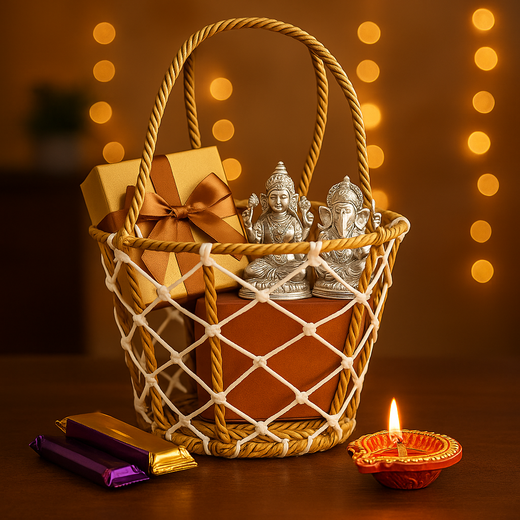 This handcrafted rope basket with cotton net weave is the perfect base for creating personalized gift hampers. Its tall cylindrical shape, sturdy rope handle, and eco-friendly design make it ideal for festive gifting, wedding return hampers, or stylish home storage.