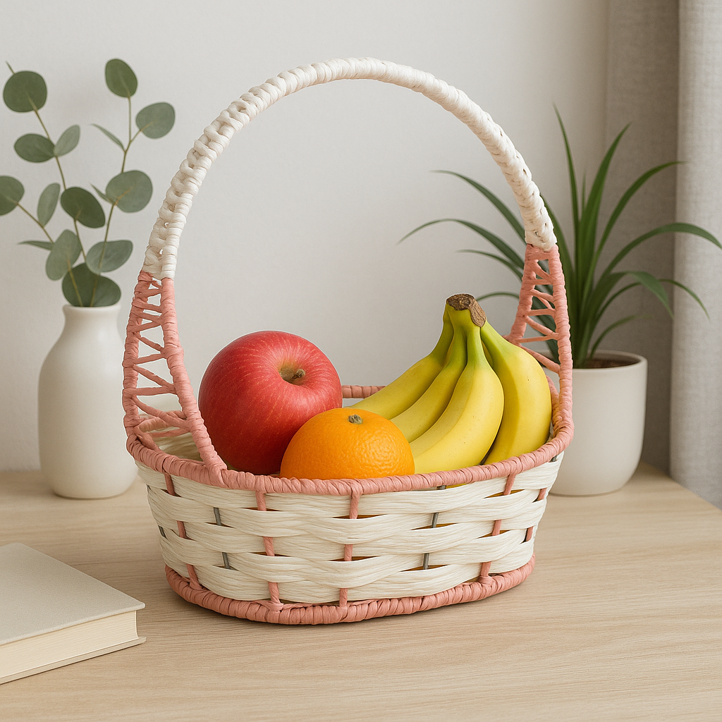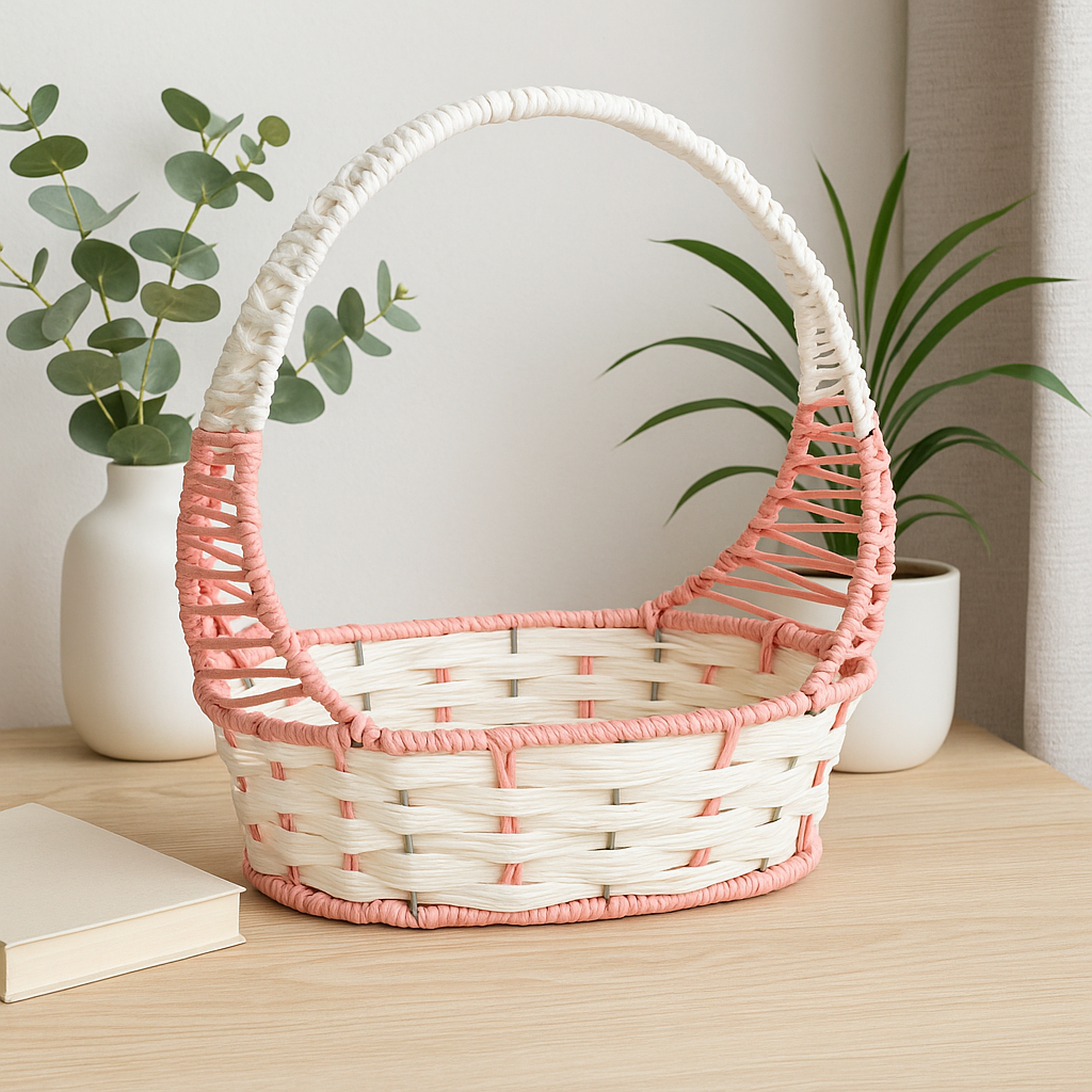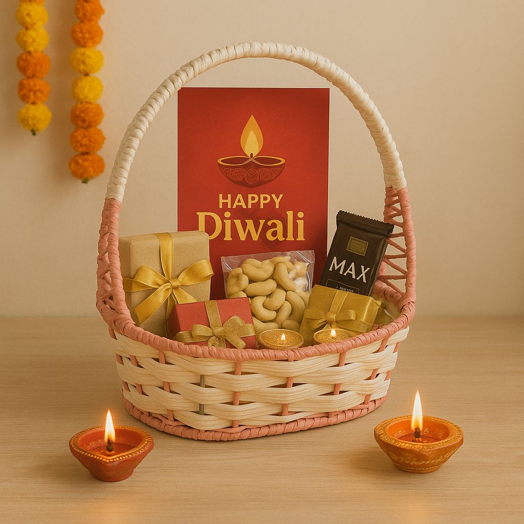 This handcrafted festive basket is designed to be the perfect base for DIY hampers. Made with strong woven material in a dual-tone finish (peach and cream), it features a sturdy handle and a spacious design. Whether you want to create a Diwali hamper, wedding gift basket, or everyday storage organizer, this basket is versatile, durable, and elegant.