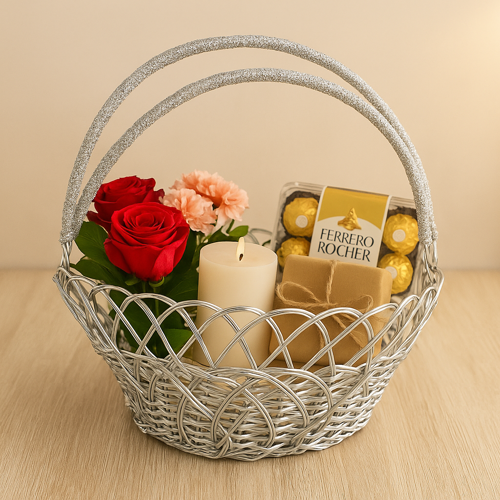Add elegance to your home or gifting with this handcrafted silver aluminum basket. Featuring a stylish woven pattern and glittered dual handles, this basket is both sturdy and decorative. Perfect for DIY gift hampers, festive décor, weddings, or everyday home storage.